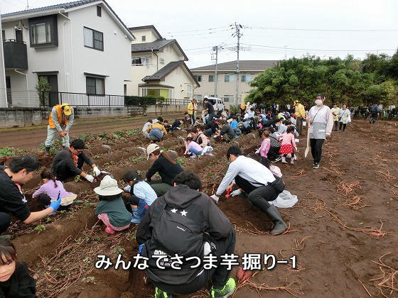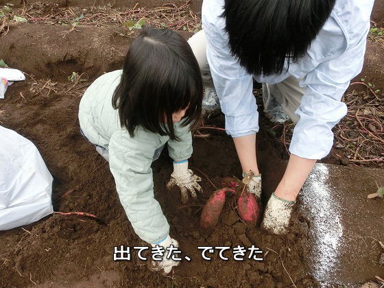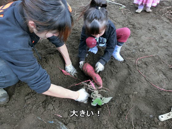 | 11/1(土)近隣の保育園児親子55組160名で、「さつま芋掘り」を体験しました。 園児たちは、さつま芋の成長を観察してきました。 今日はまちにまった親子での「さつま芋掘り体験」です。 土の中からさつま芋が顔を出すと、歓声が上がります。 大きなさつま芋にビックリ、みんなで予想以上に沢山収穫できました。 |